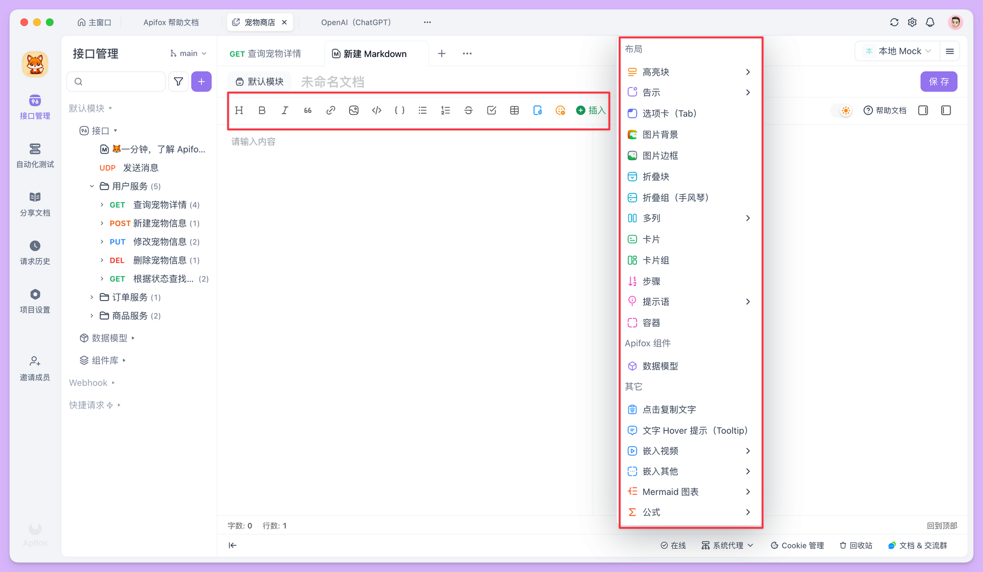 Apifox 内置了功能强大的 Markdown 编辑器:
