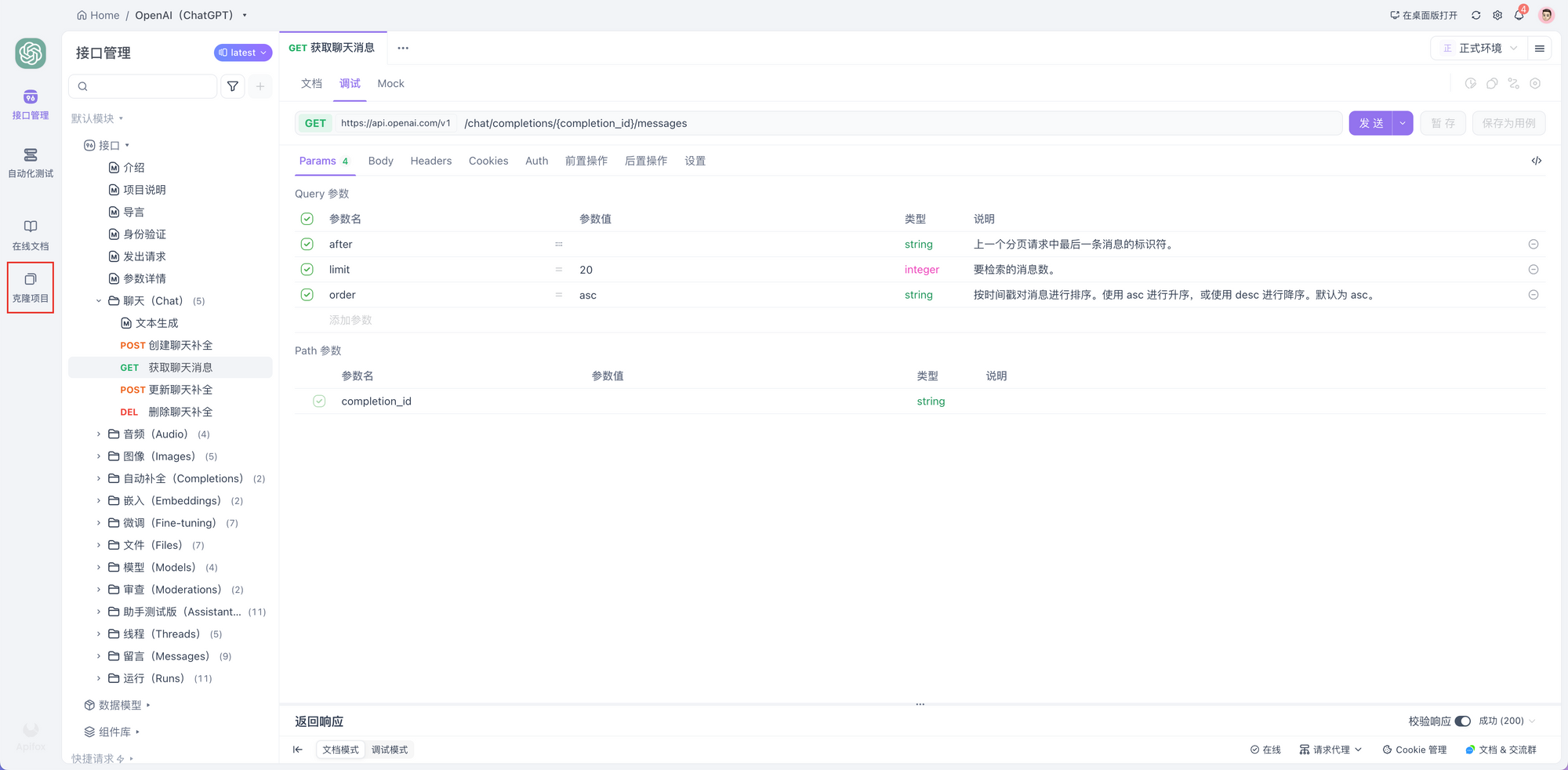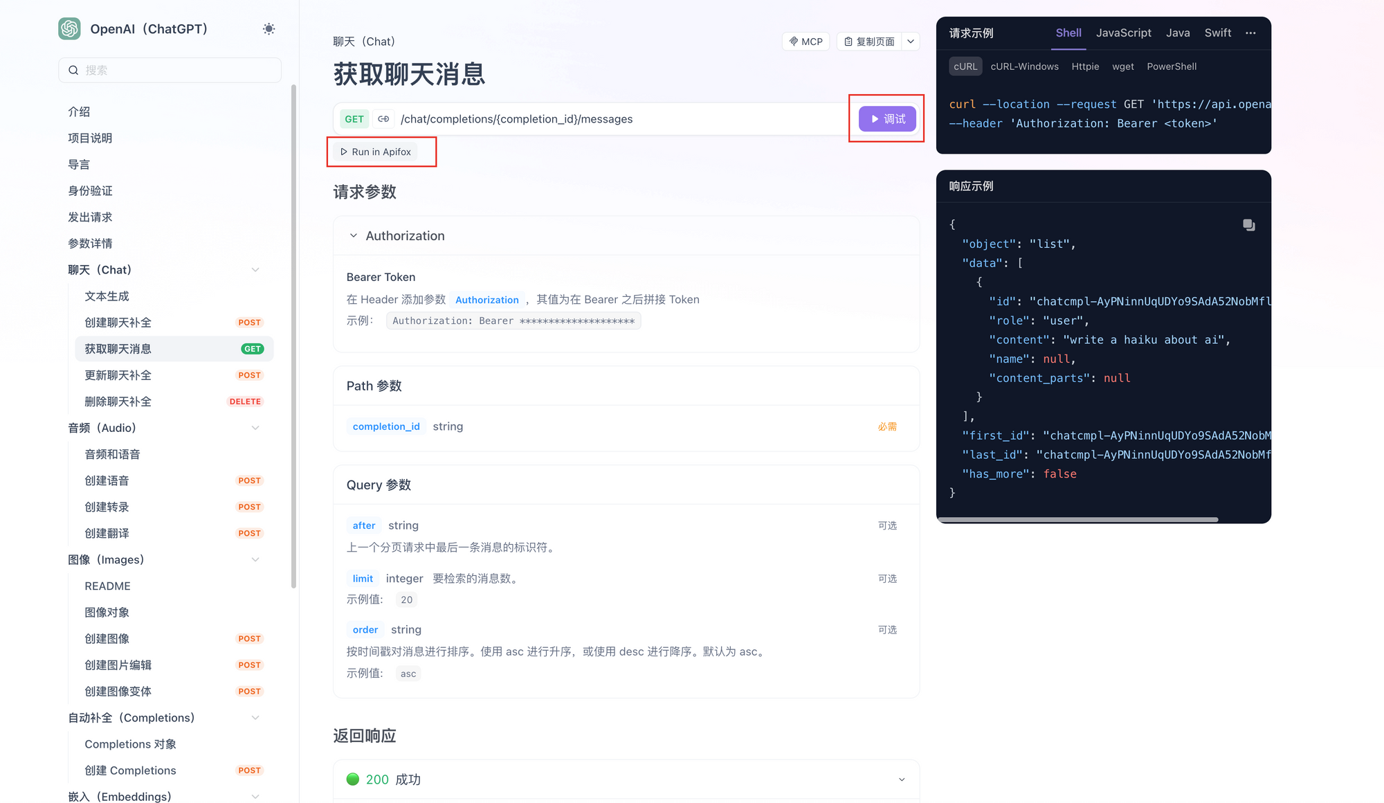 点进去到 OpenAI 的文档,我们发现都是中文的,且拥有 OpenAI 的所有接口。可以在线调试,也可以克隆到 Apifox 中调试。