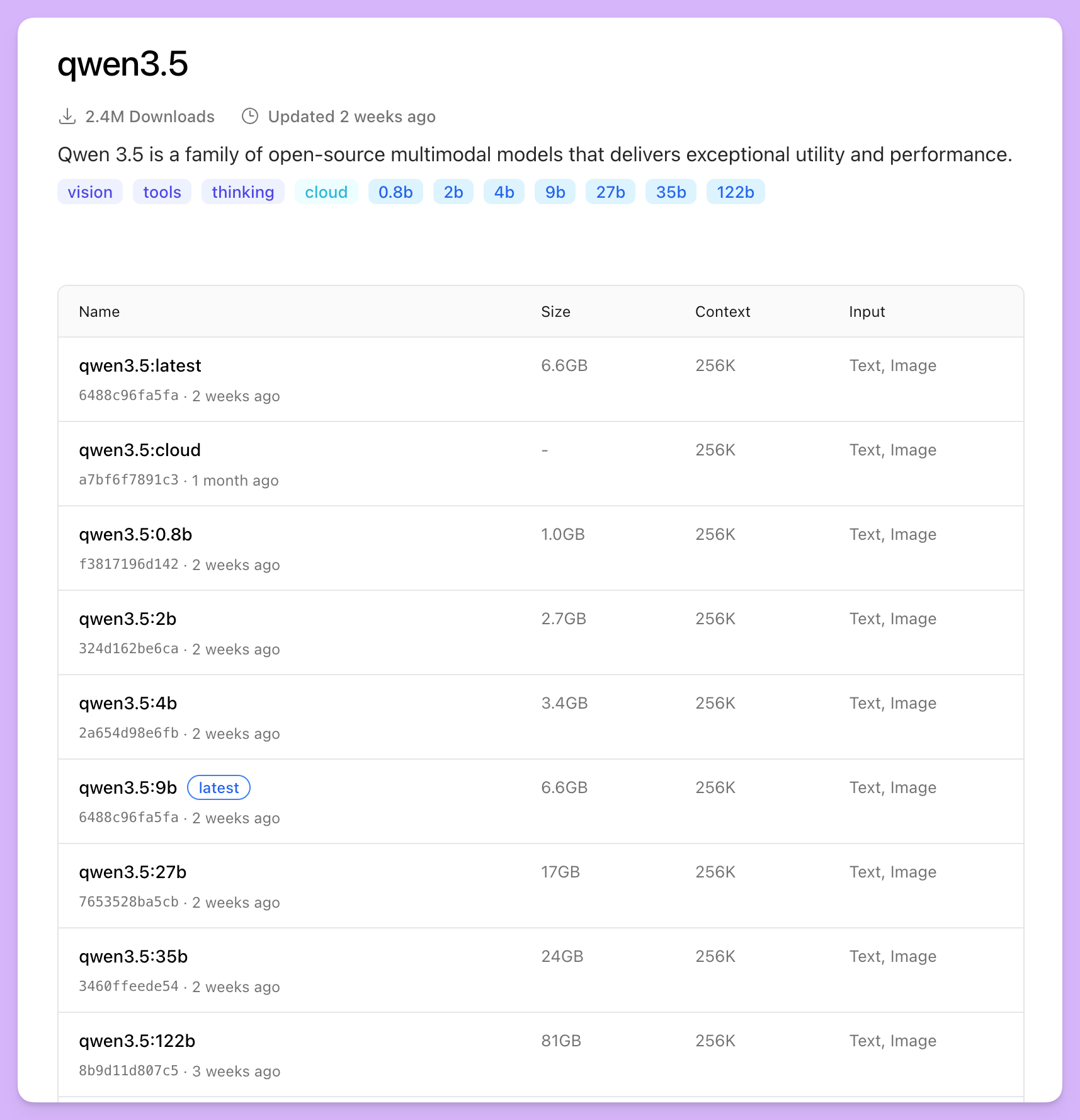 ollama run qwen3.5:0.8b地址:https://ollama.com/library/qwen3.5/tags