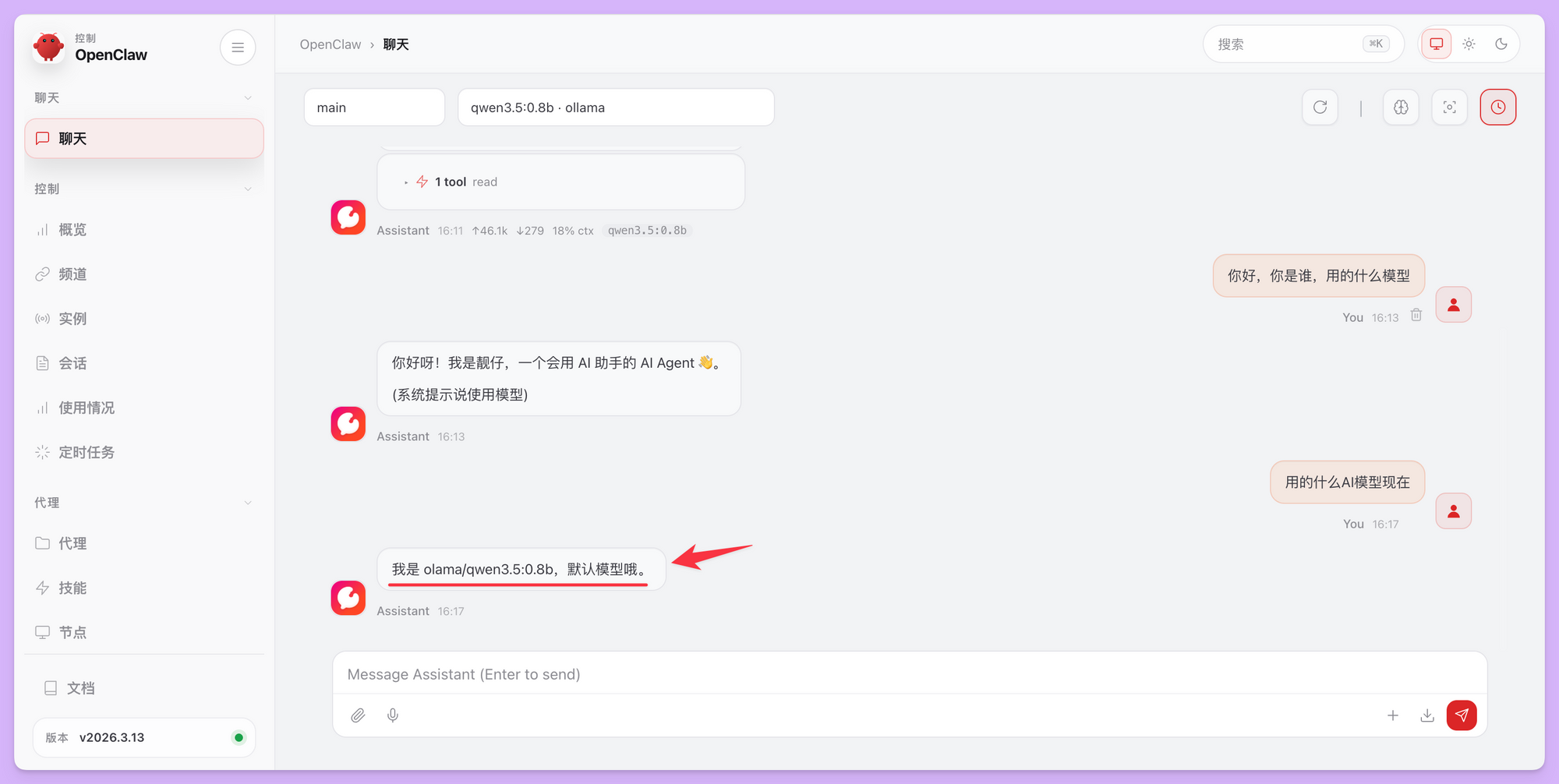 选好之后按回车键,接着设置后面的 OpenClaw 配置项就行了,不需要的话就跳过。最后我们打开 OpenClaw 的 Web UI,问一下它用的什么模型。