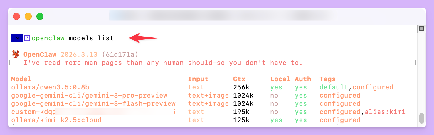 如果在 openclaw models list 的输出中没有看到预期的模型,请先用 ollama list 确认该模型是否已在本地安装。如果没有,使用 ollama pull 或 ollama run 下载即可。