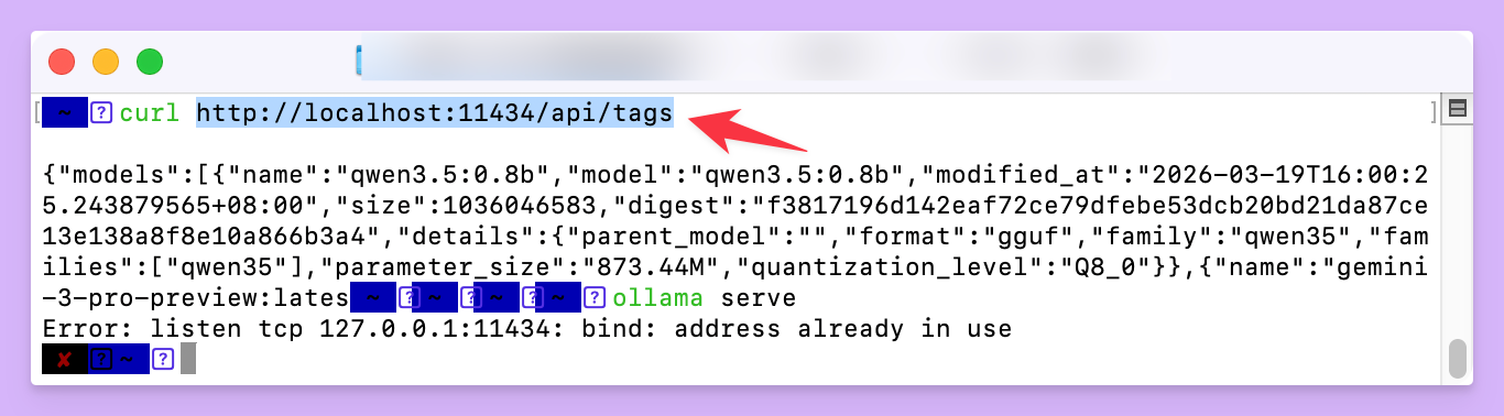 可以通过 curl 命令测试 Ollama API 是否可以访问。