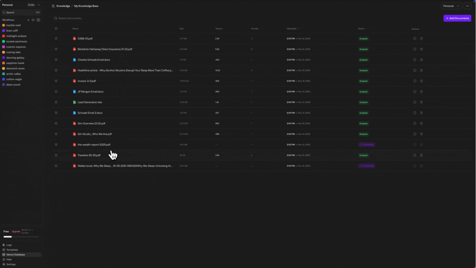 现代 AI 应用离不开与特定知识的结合,也就是我们常说的 RAG(Retrieval-Augmented Generation)。Sim 支持与向量数据库的无缝集成。你可以轻松上传自己的文档(如 PDF、Markdown 等),Sim 会将其处理并存入向量知识库。这样,你构建的 Agent 就能根据这些私有数据进行问答,提供更具针对性和准确性的回复。